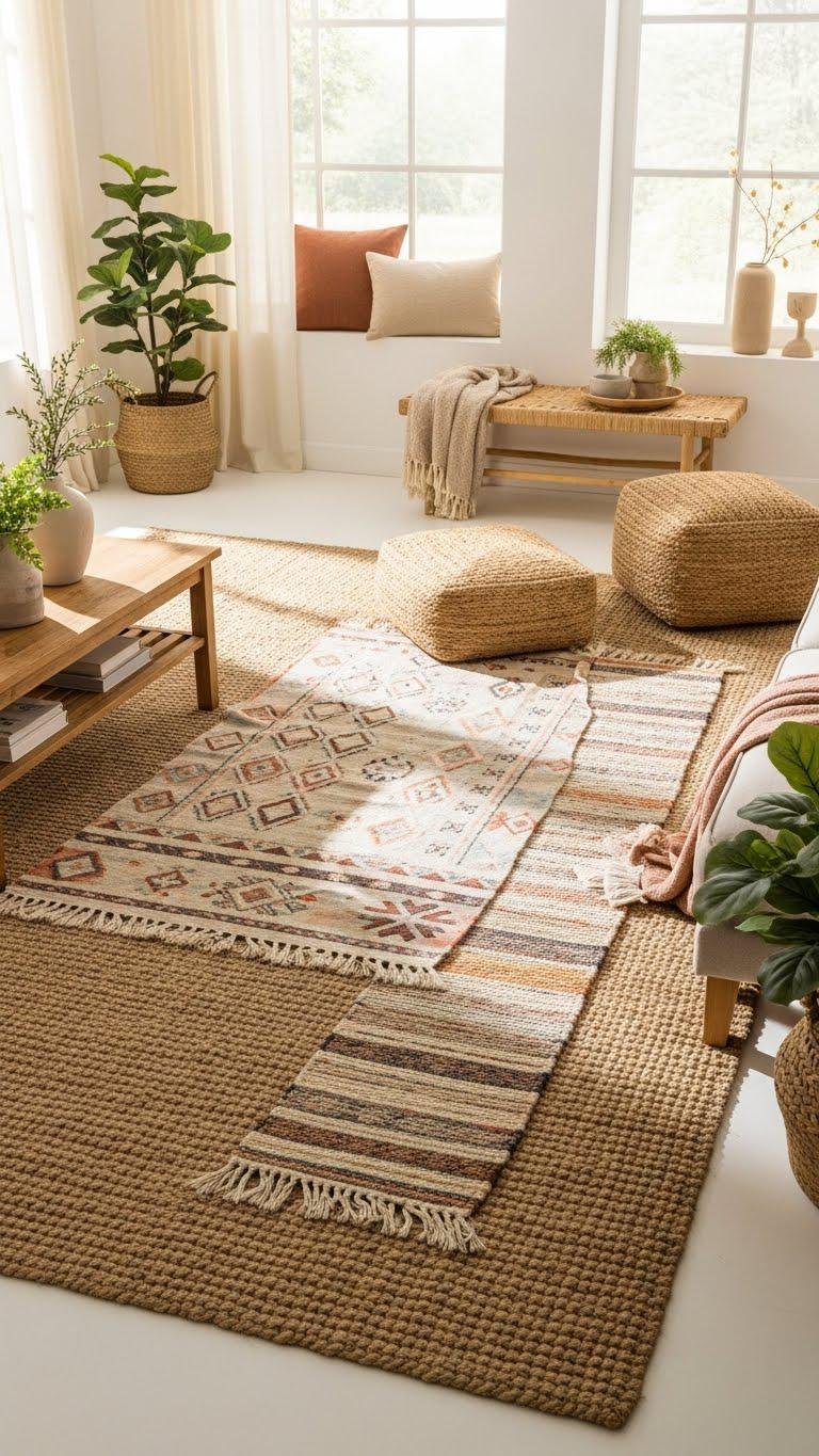 Choose layered textures—handwoven runners, sisal rugs, and lightweight kilims—to define zones without weighing the space.