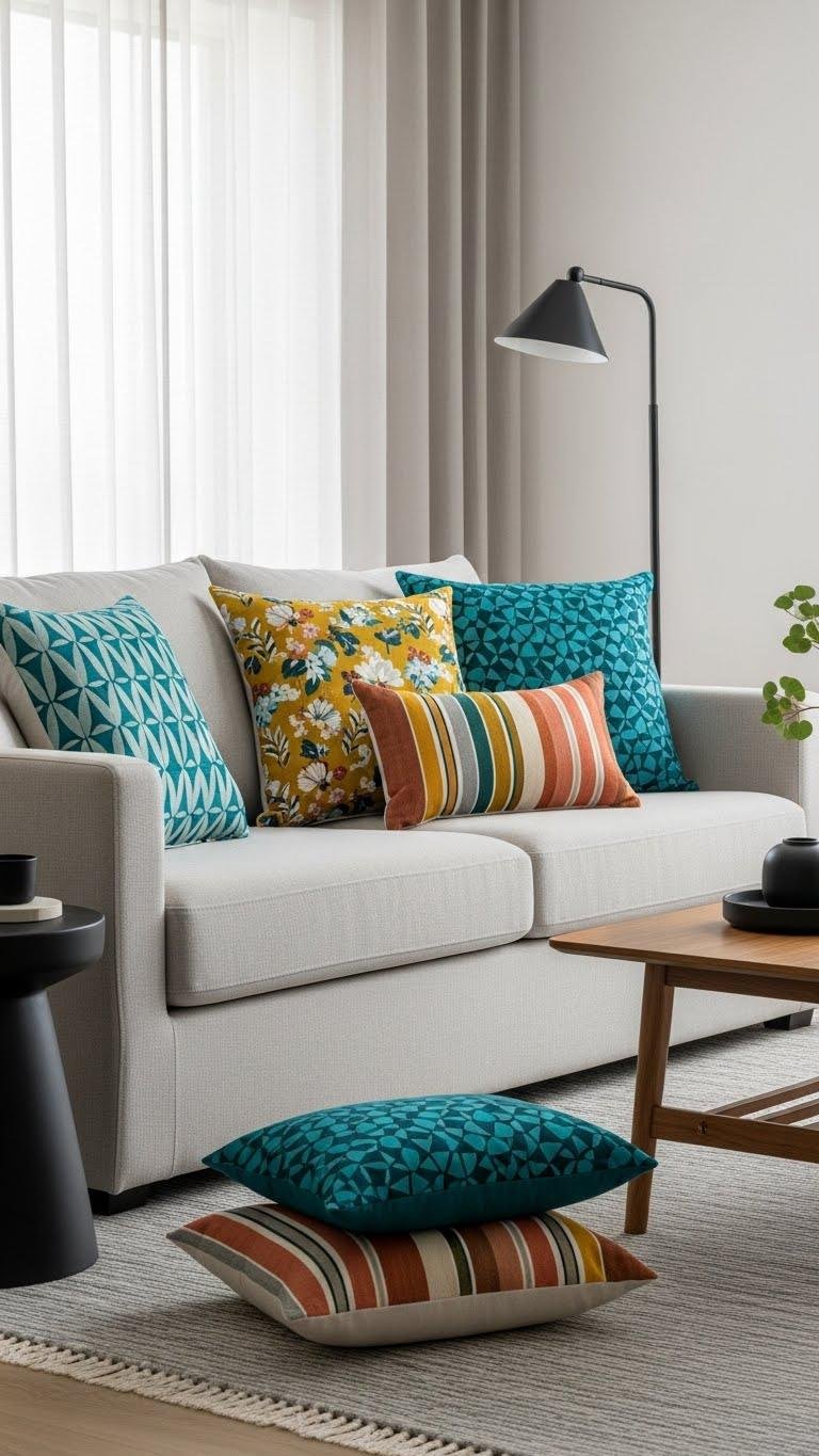 Inject bold patterns into your living room while grounding them with neutral anchor pieces to keep the look modern and intentional.