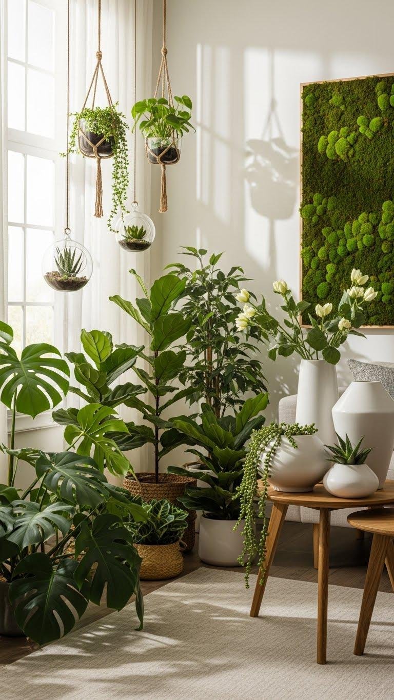 You’ll layer large leafy specimens with hanging terrariums for height and intimacy, pair sculptural pots with low-maintenance succulents, and consider moss walls as a calming focal point — all choices that feel liberated, modern, and effortlessly refined.