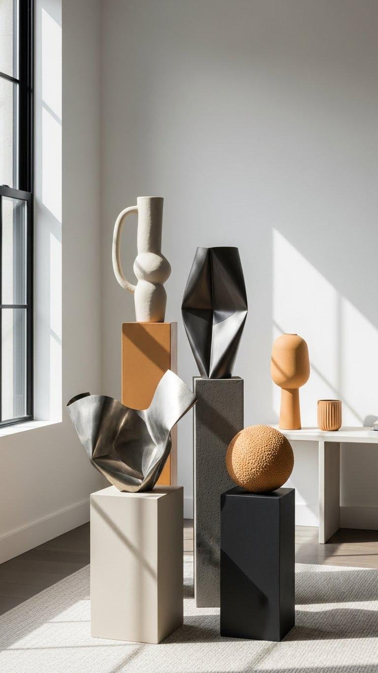 Bring in a few bold sculptural accents to lift the room’s personality and anchor your design — they’re the kind of pieces that catch the eye and start conversations. You’ll mix artistic vases, tactile objects, and metal or ceramic forms on minimalist pedestals to create focal points. Choose pieces that reflect freedom: sculptural yet functional, curated sparingly so each statement accessory resonates.