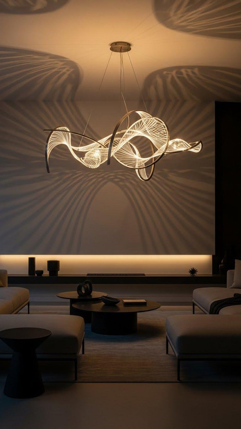 When you place a sculptural light fixture at the heart of the room, it does more than illuminate — it defines the mood, anchors the layout, and reads like a piece of modern art that happens to hang from the ceiling.