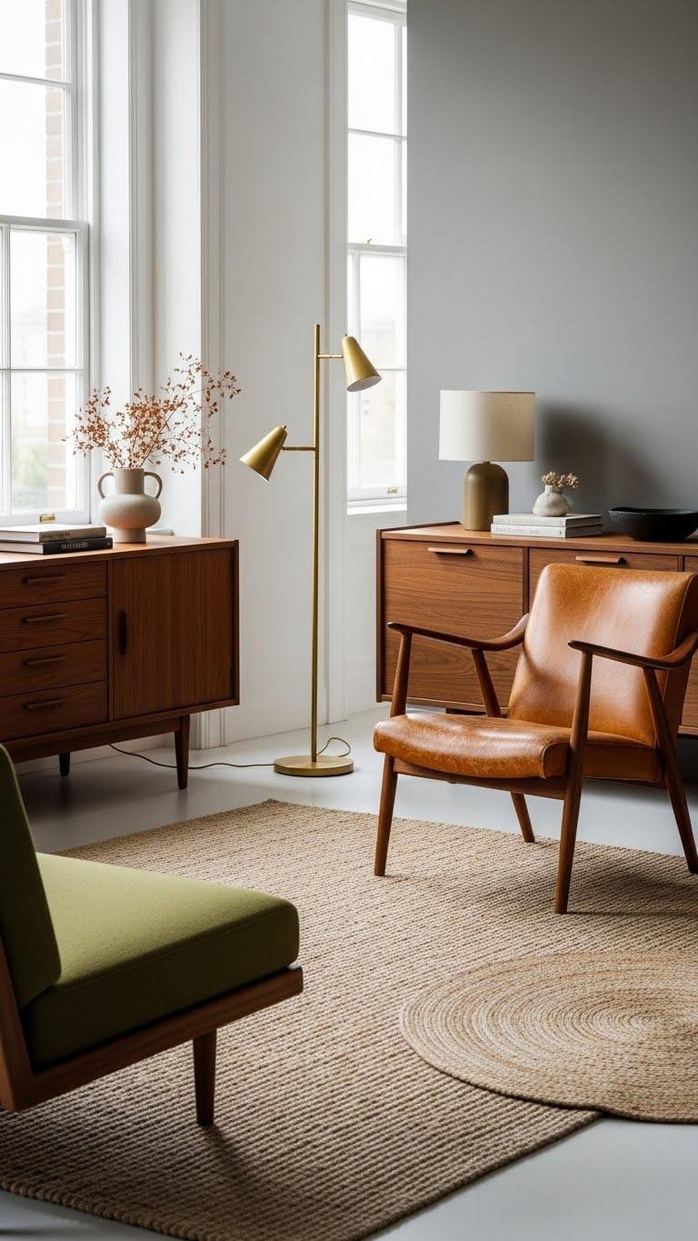 Lean into contrast by pairing clean-lined midcentury silhouettes with a few carefully chosen vintage finds that bring warmth and character without cluttering the aesthetic. You’ll master patina pairing by mixing aged metals and fabrics with sleek forms, and celebrate teak reinvention through refreshed finishes.