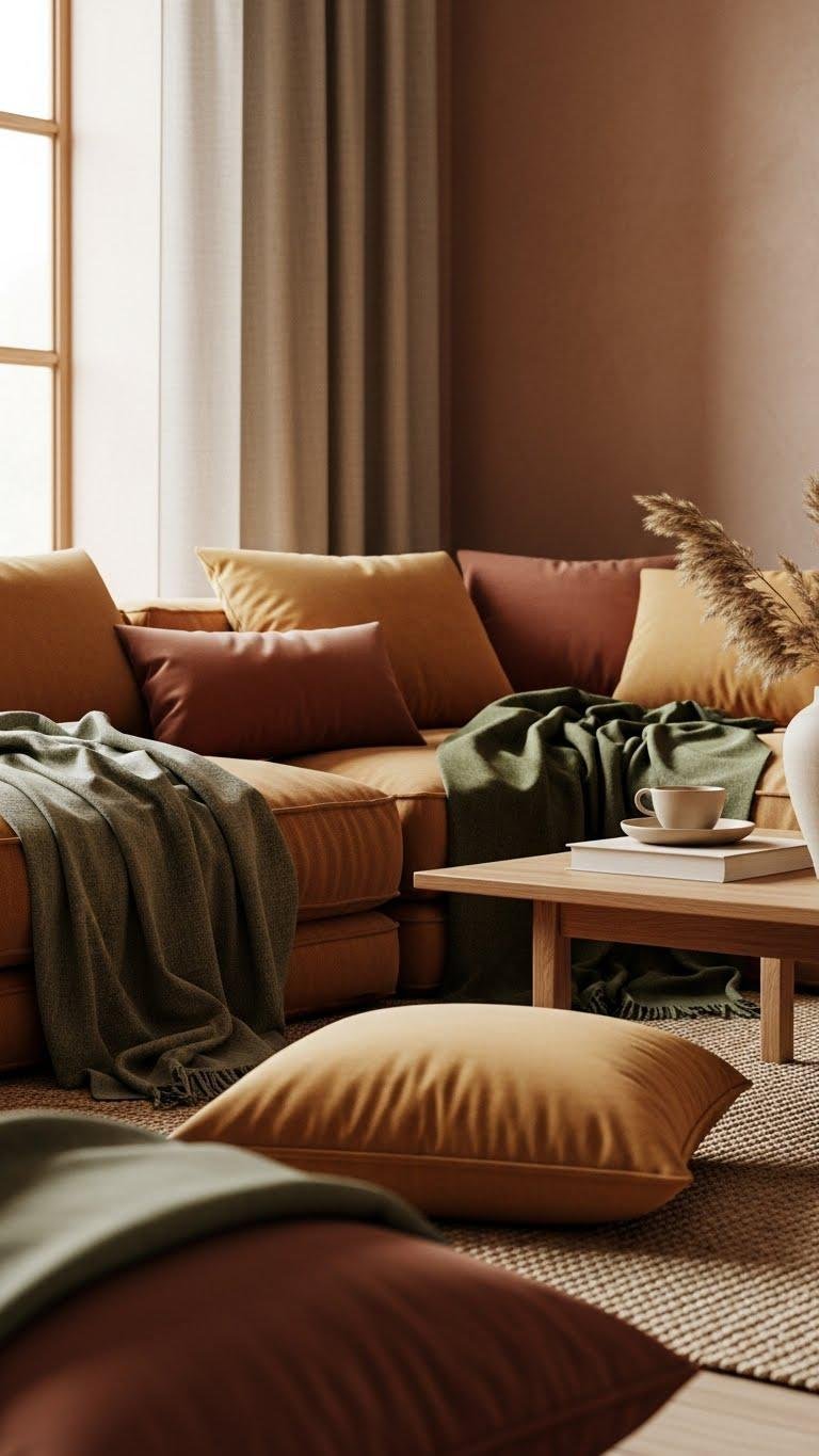 Start with a warm foundation: layer muted ochres, terracottas, mossy greens and soft clay tones to create depth without overwhelming the room. You’ll choose earth tones that ground the space, mixing matte paints with tactile fabrics.