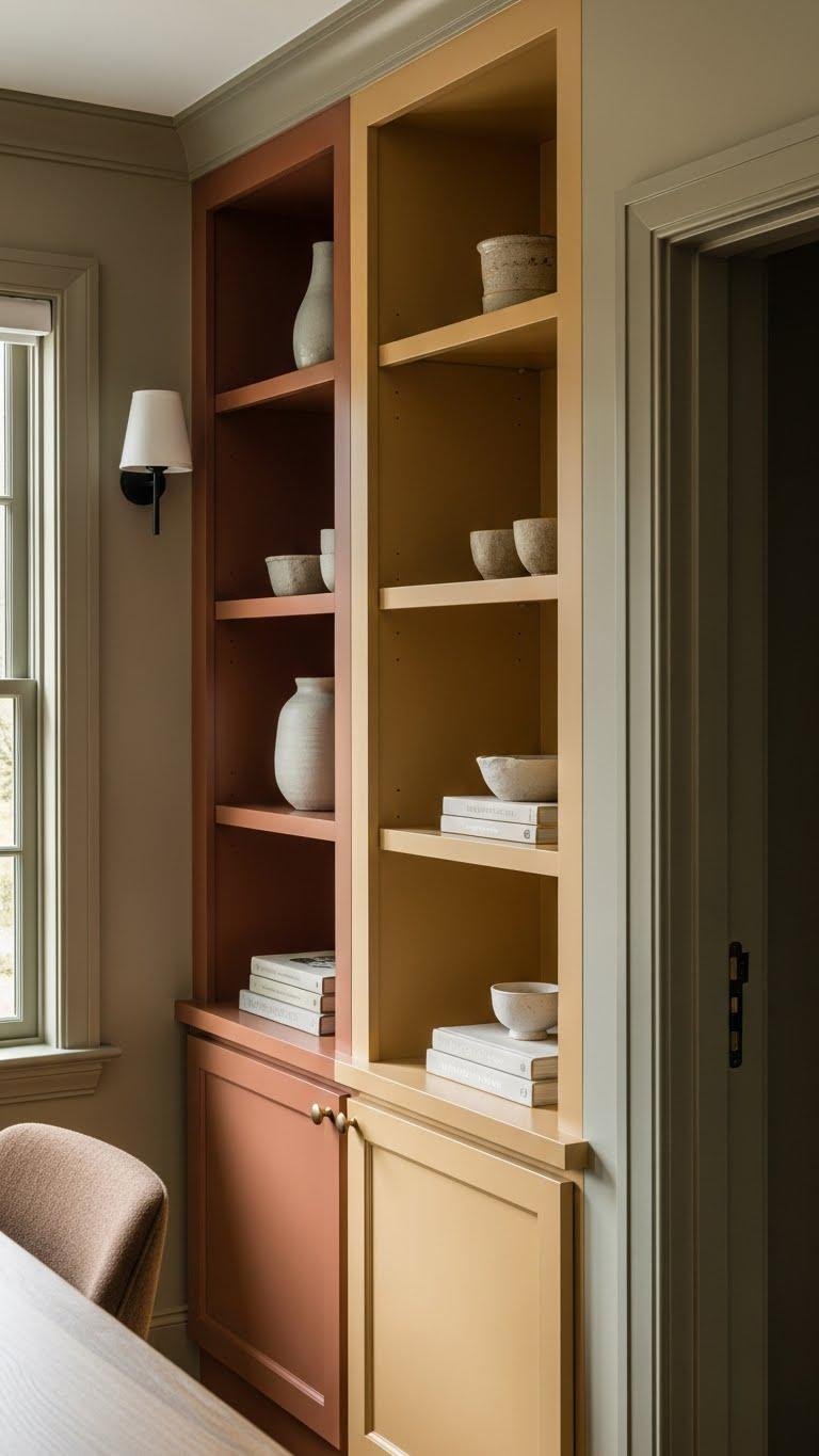 After grounding your palette in warm ochres, terracottas and mossy greens, paint the room’s built-ins to carry that mood with purpose. You’ll create cohesion by choosing muted tones for shelving, then highlight accented trim in a deeper shade. Contrast open shelving interiors with lighter or contrasting interiors to showcase objects.