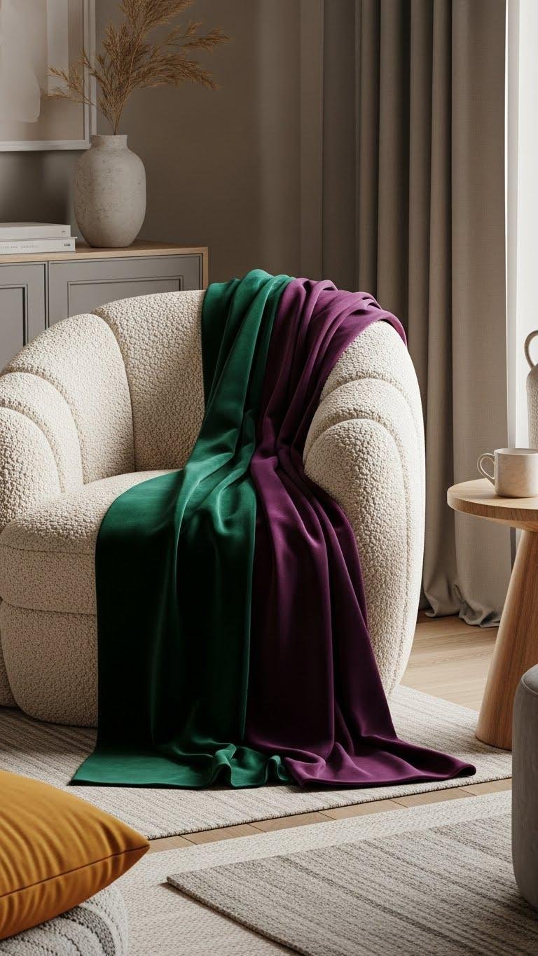 You can anchor seating with bouclé chairs for sculptural comfort, then drape velvet throws to introduce color and luxe softness.
