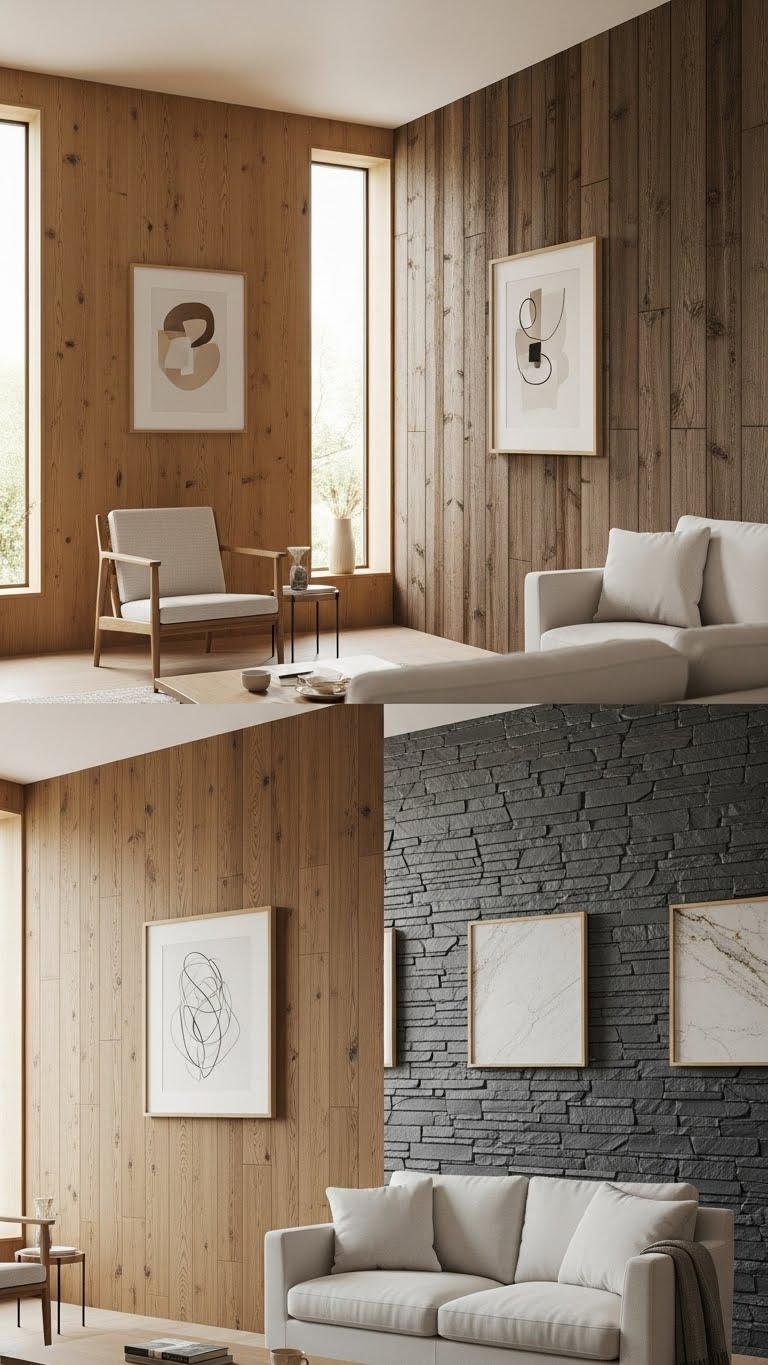 Anchor your living room with a natural-texture wall in wood or stone to add tactile warmth and visual depth—choose a grain-forward oak panel, reclaimed planks, or a honed stone slab depending on the room’s scale and light.