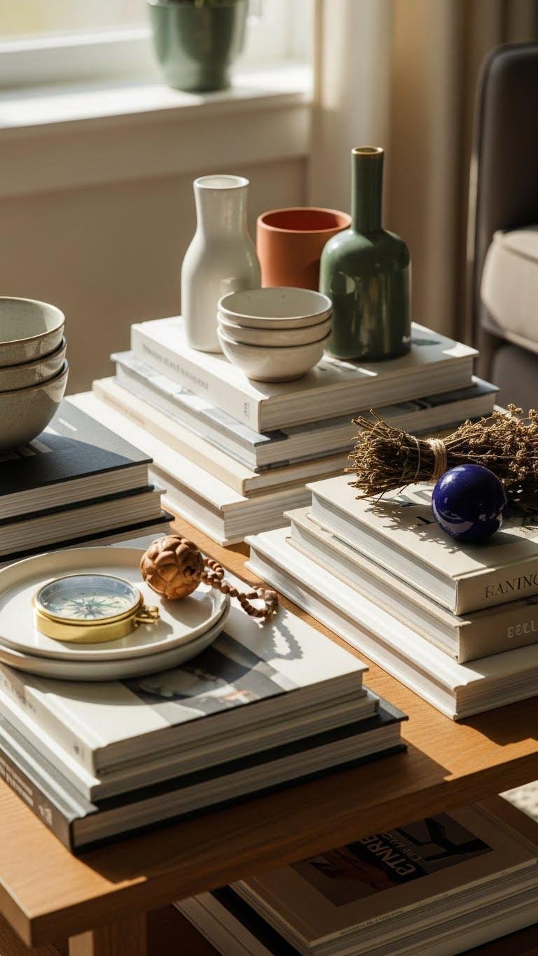 Layer in books, ceramics, and small finds to give your living room personality and a considered, collected look. Mix vintage ceramics with sleek modern pieces, anchor groupings on stacked coffee tablebooks, and vary heights for movement. Keep palettes intentional, limit repeats, and let one unexpected object suggest wanderlust. You’ll create a liberated, curated space that feels lived-in, fresh, and unmistakably yours.