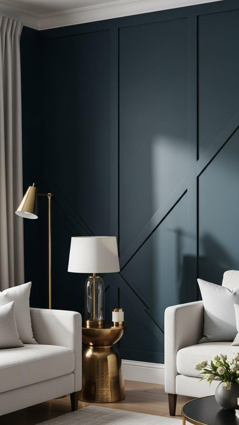 Choose a velvet backdrop finish or matte, pair with subtle geometric panelling for depth, and balance with lighter textiles and metallic accents so the space feels bold, liberated, and effortlessly curated.