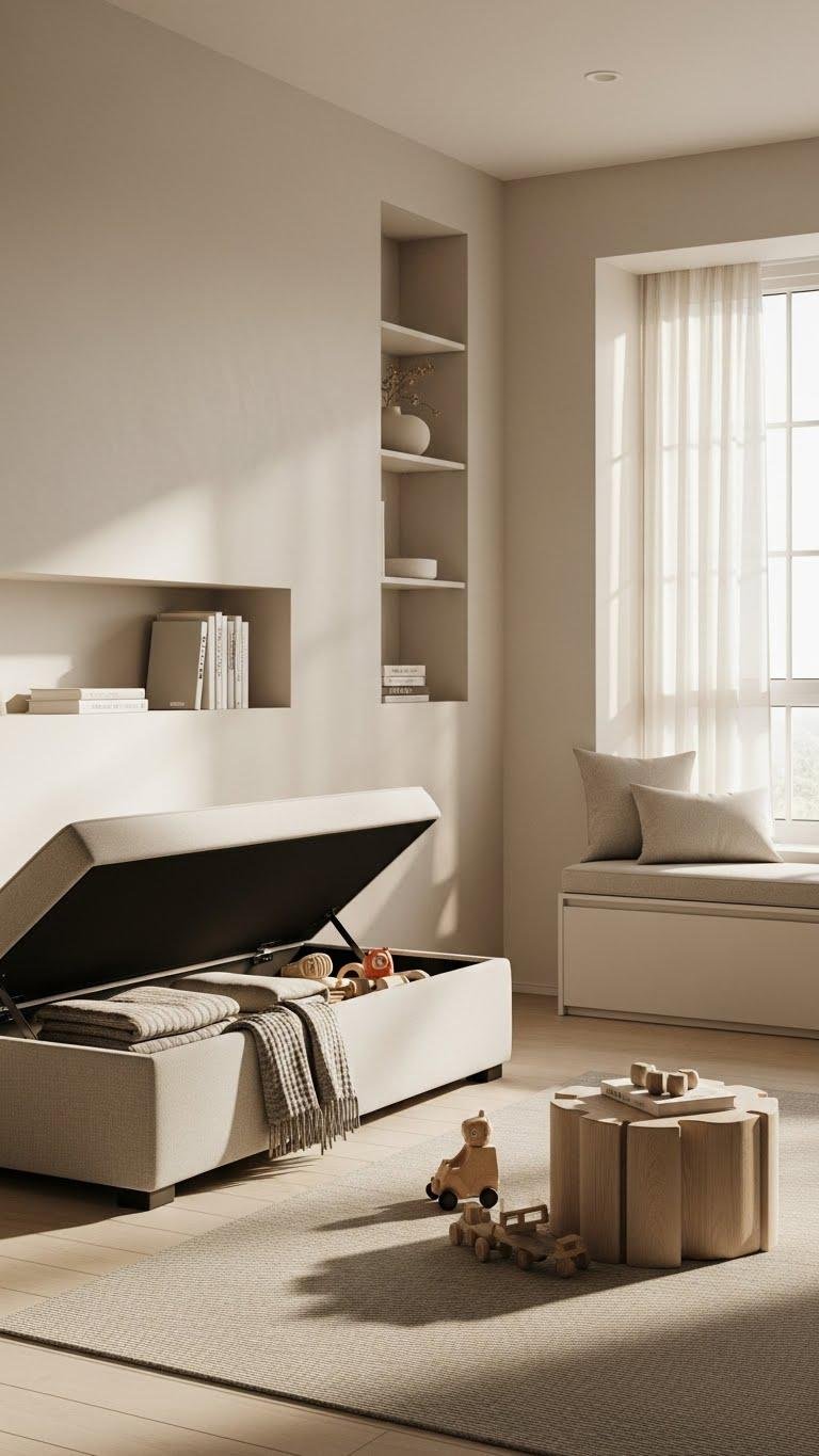 Give yourself freedom with concealed solutions—choose a hidden ottoman for throws and toys, add recessed shelving to tuck books flush with the wall, and use low-profile storage benches.