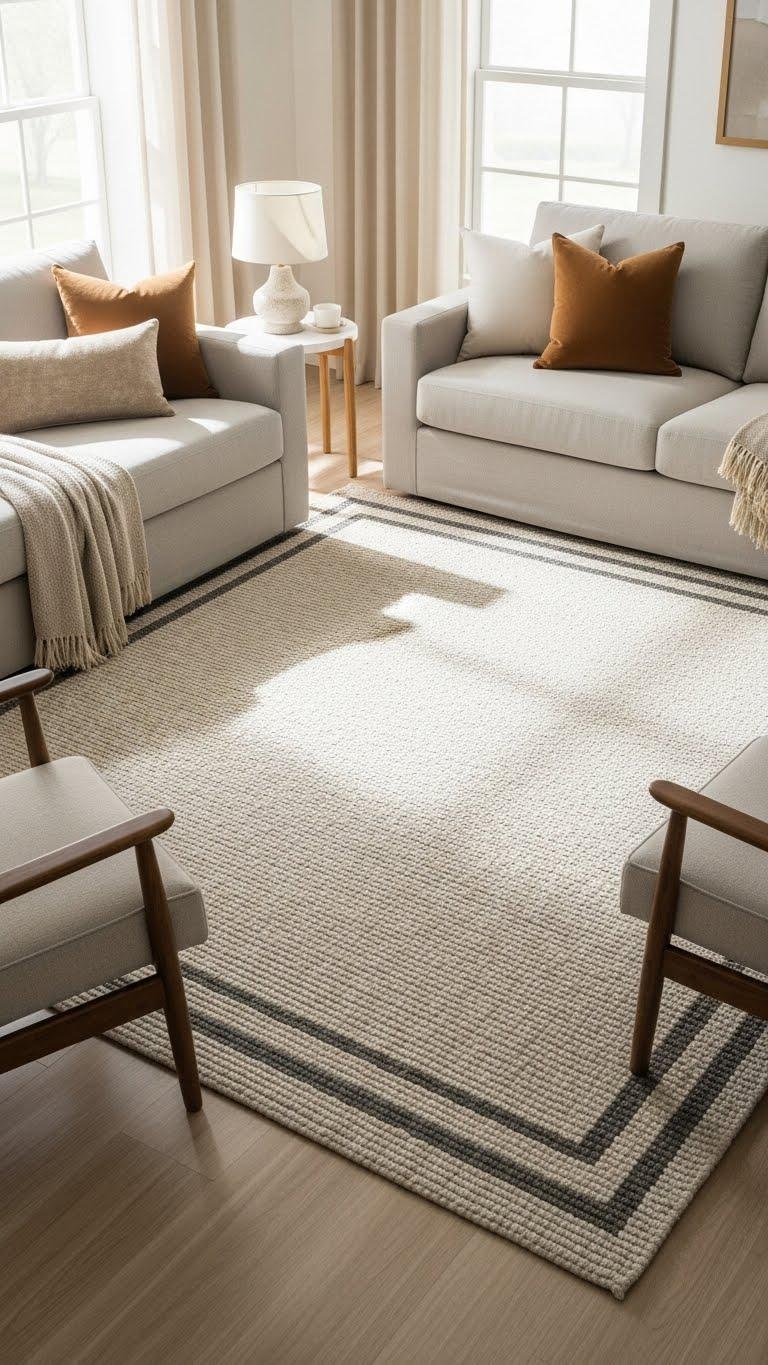 Choose a rug that defines the seating area and sets the room’s scale—don’t pick something that disappears under furniture or floats awkwardly in open floor.