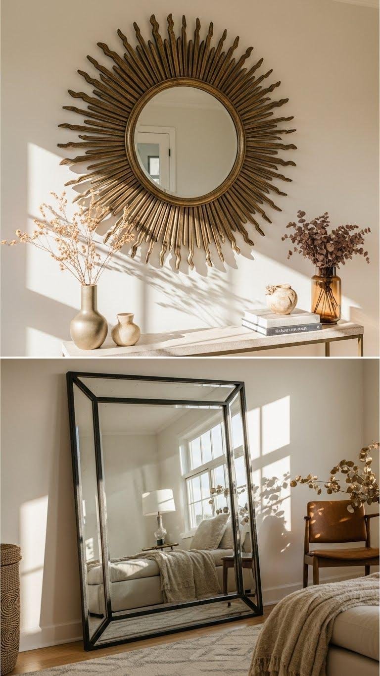 A large, sculptural mirror instantly opens a room by bouncing light and doubling visual depth, so pick one with a bold frame or unusual shape that complements your decor. Hang an antique mercury mirror for moody patina or an oversized sunburst to energize a wall. Center it above a low console, lean it for casual flair, and let reflections expand your freedom-filled space.