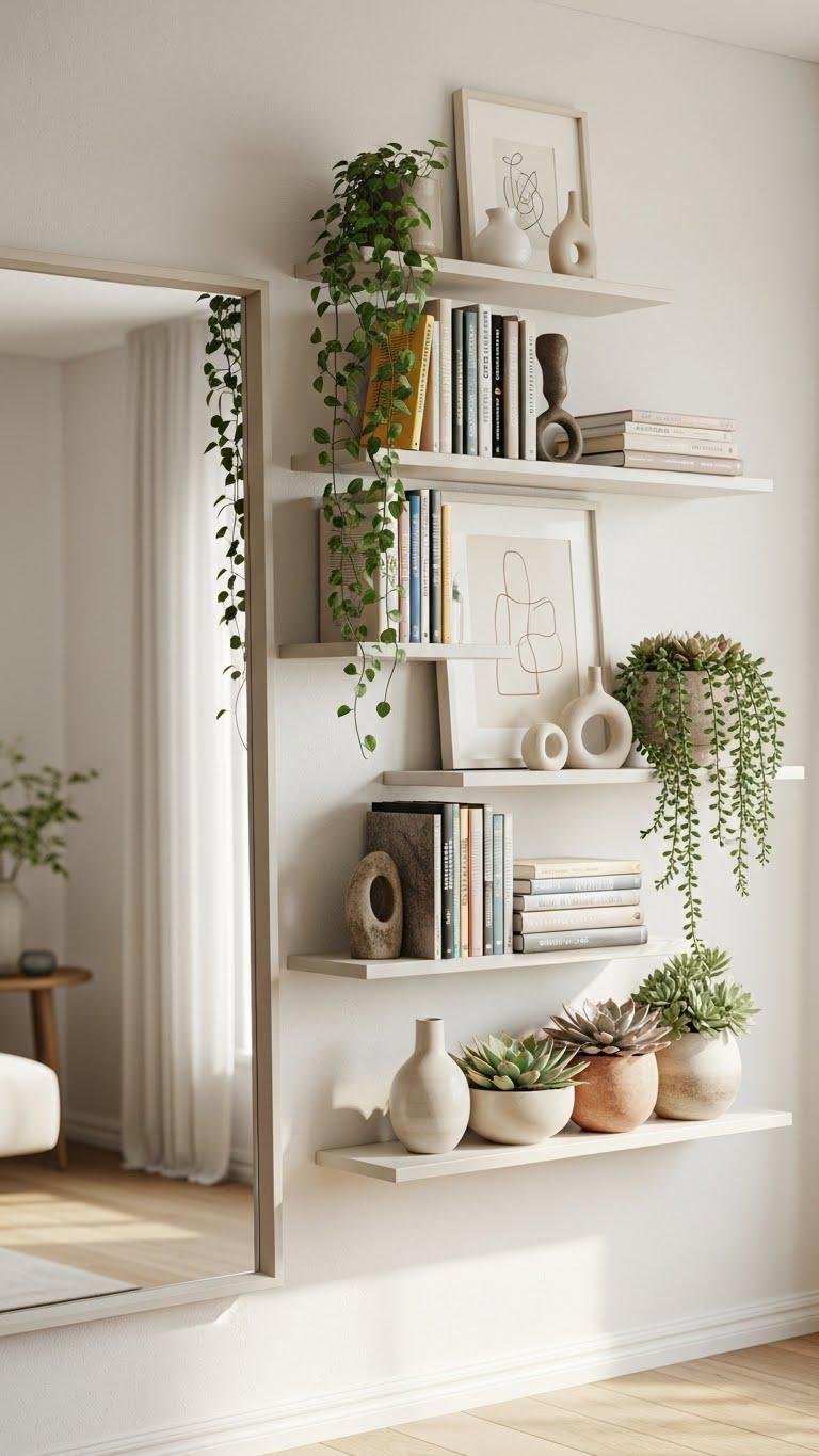 Mirrors expand a room by playing with light and scale, while floating shelves give you a chance to curate that newly amplified space with personality. You’ll build a floating library mixing hardbacks, art, and small sculptures, punctuated by botanical vignettes — trailing pothos or succulents in varied pots.