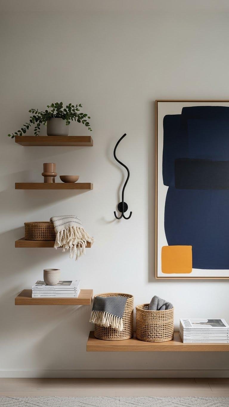 If you want a wall that works as hard as it looks, combine low-profile shelves, a sculptural hook, and curated art to create a single, streamlined vignette that balances storage and display. You’ll anchor floating hooks beside staggered shelves, tuck decorative baskets for throws or magazines, and let one bold artwork set rhythm. The result feels practical, airy, and intentionally free.