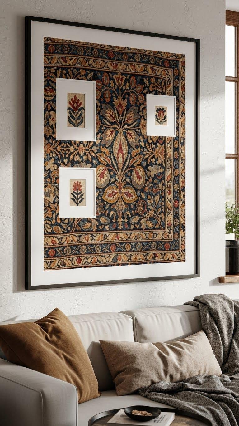 Though textiles often feel like soft accessories, framing a vintage fabric turns it into a striking focal point that anchors a room with texture, history, and color. You’ll display an antique textile as a framed heirloom, choosing simple mats and narrow frames to highlight a bold botanical print or an intricate ethnic motif. It frees your space, balancing modern minimalism with soulful character.