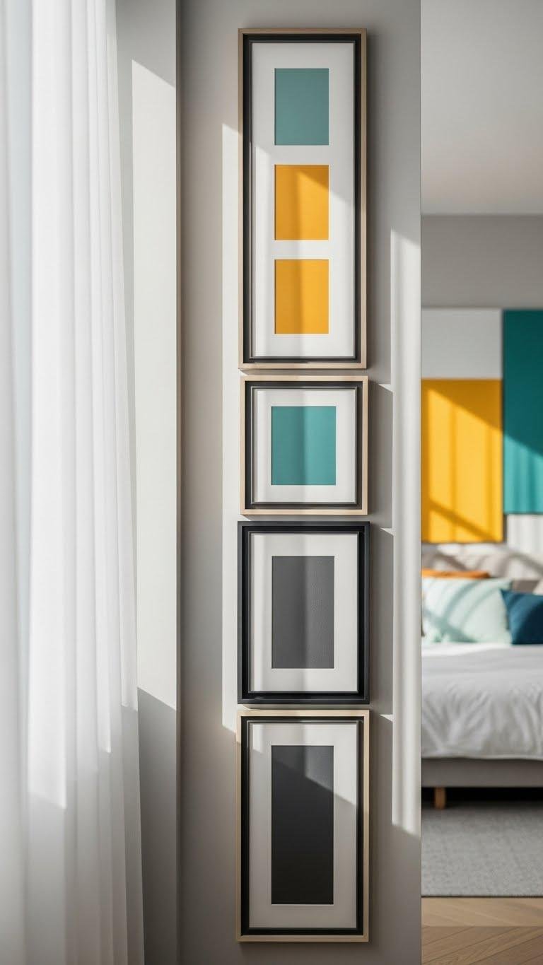 For a narrow wall sliver, stack art vertically to make the most of limited width and draw the eye upward; you’ll create a sleek, gallery-like column by combining similarly framed pieces or varying sizes that share a common visual thread (color, mat, or frame finish). Choose slim canvases or vertical triplets, keep spacing tight, and let rhythm and negative space give the wall room to breathe.