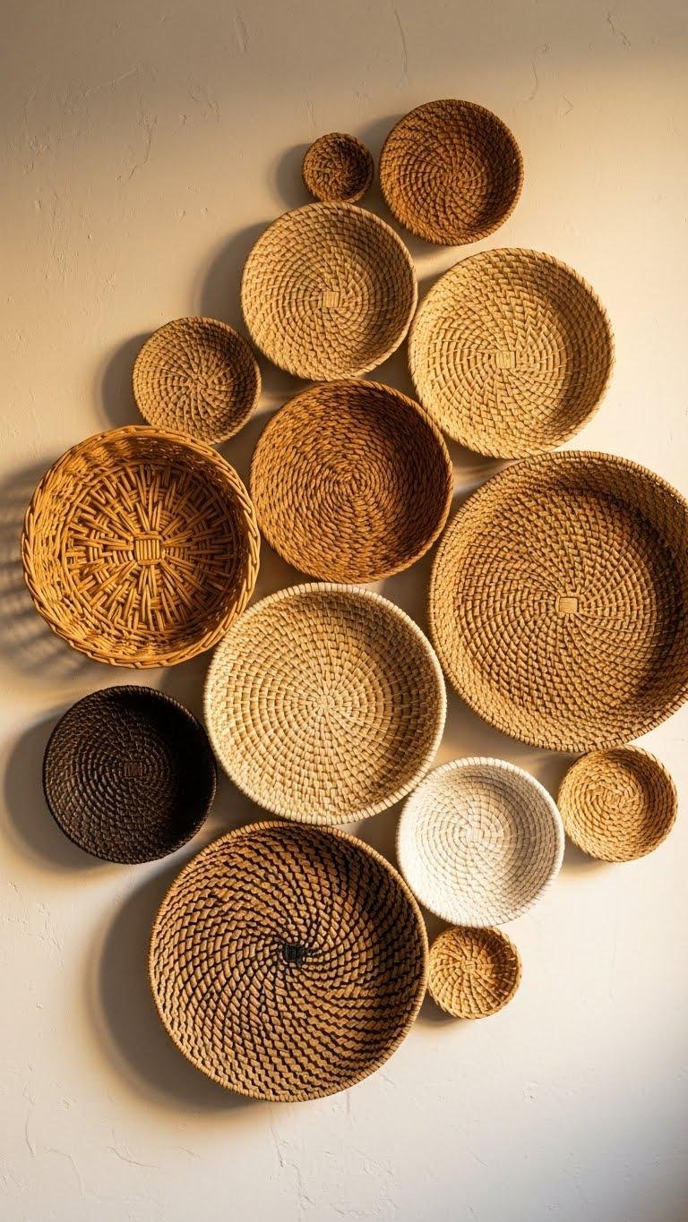 Anchor a wall with a rhythmic cluster of woven baskets to add texture, warmth, and an organic pattern that feels both crafted and effortless. You’ll compose a woven rhythm by mixing sizes, tones, and weaves, placing pieces to create intentional basket symmetry without rigid grids. The result feels liberated and calm—dynamic repetition that anchors the room while leaving visual air and movement.