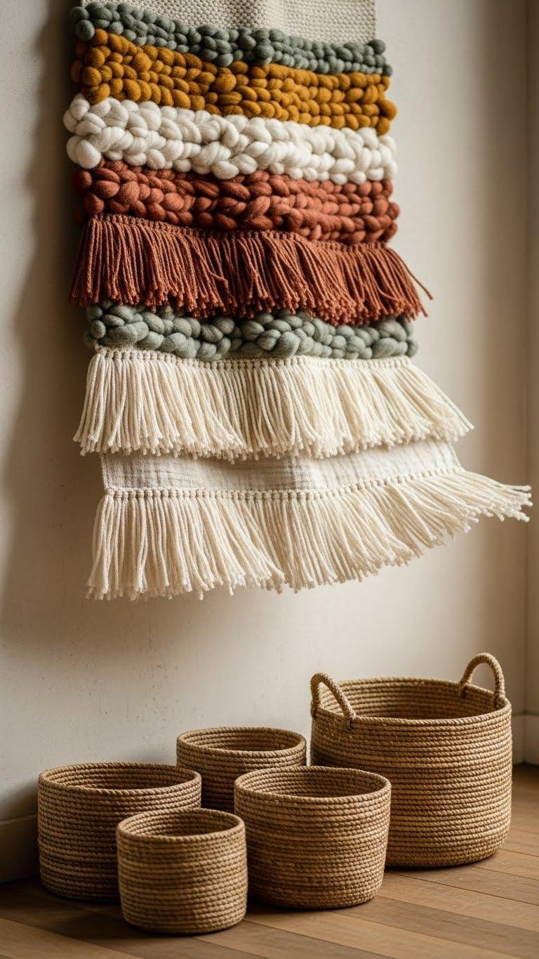 After a cluster of woven baskets brings rhythm and texture, a textile wall hanging will soften the room with layered color and movement. You’ll choose fibers that introduce softening texture and tactile contrast against hard surfaces, like chunky wool or linen with fringe. Hang it slightly off-center to create relaxed balance, let it flutter with air, and enjoy the liberating warmth it adds.