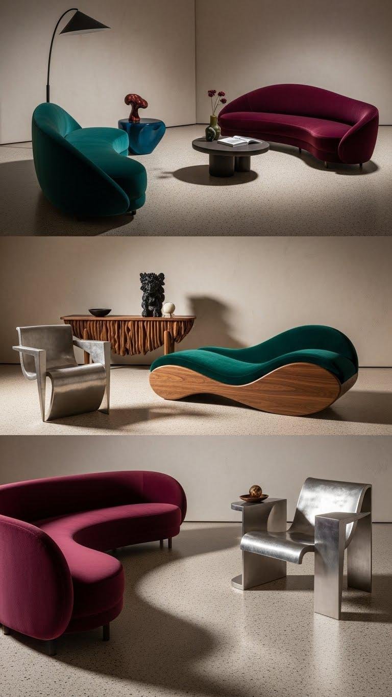 Anchoring a maximalist room, sculptural furniture turns function into statement — you’ll choose pieces with bold profiles, unexpected curves, and tactile finishes that read like art from every angle. You’ll favor organic silhouettes and modular curves, pairing expressive solos that invite movement and freedom. Select materials that sing—velvet, brushed metal, carved wood—so each piece commands attention without apology.