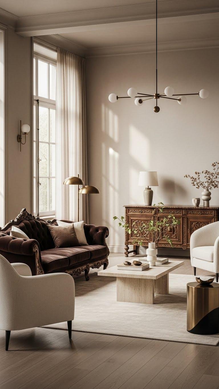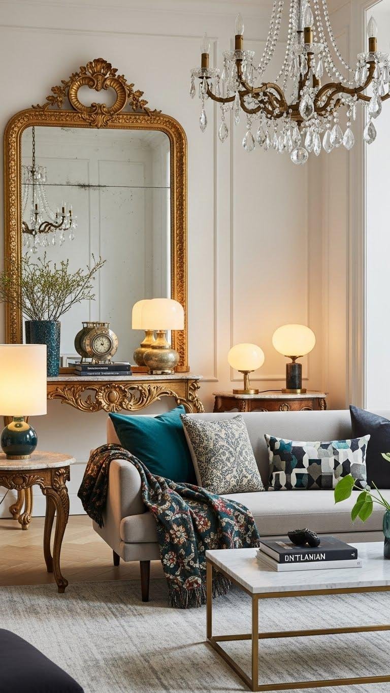 Because contrast creates conversation, mix vintage ornament—think carved cabriole legs, gilded mirror frames, or a Rococo chandelier—with streamlined contemporary pieces so each era uplifts the other. You’ll harness period juxtaposition and temporal contrast to craft rooms that feel liberated and intentional.