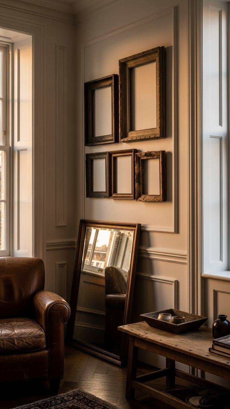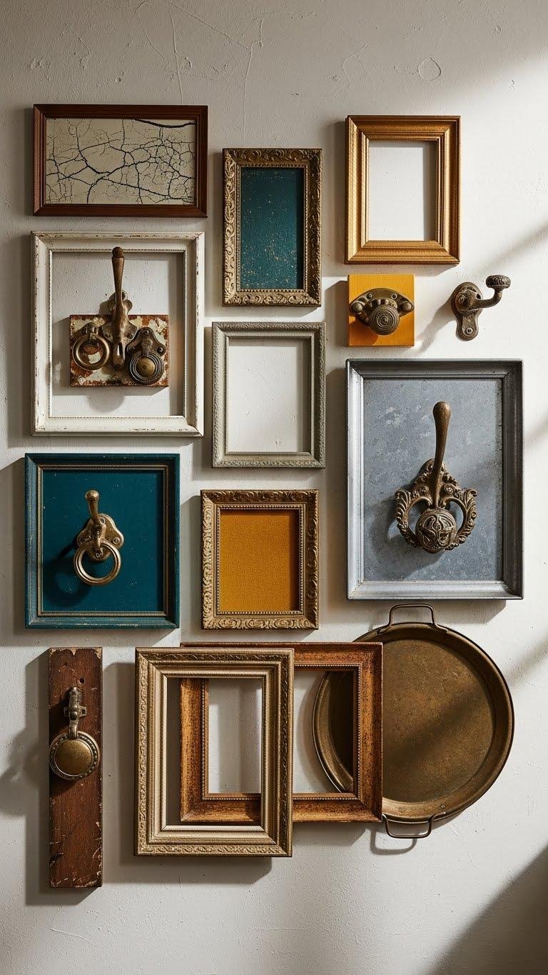 Curate with found object framing: mismatched frames, doorknobs, trays turned art. Mix flea market provenance with bold color and negative space to let each relic breathe.