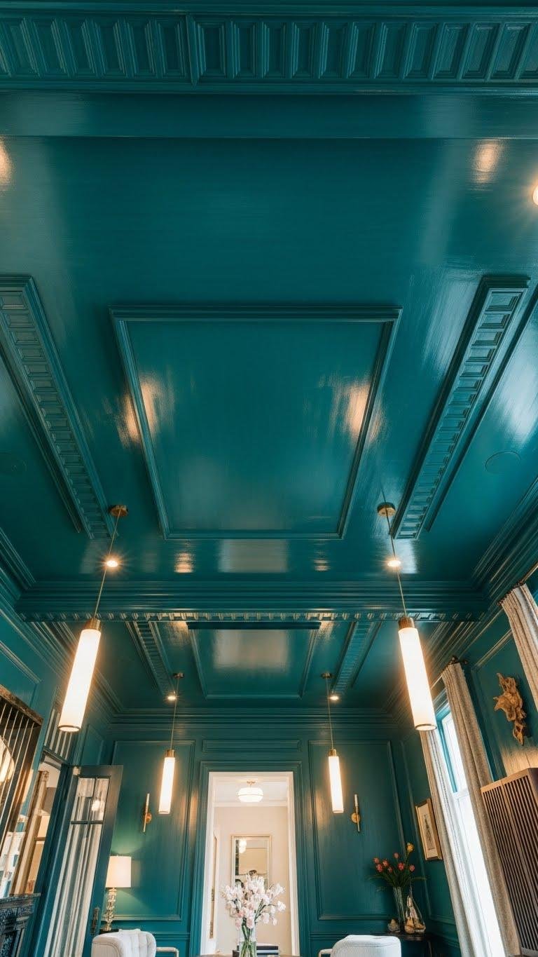 A painted ceiling can flip a room’s hierarchy and become your boldest design move, so go big with saturated hues that command attention and lift the whole space. You’ll choose glossy lacquer for drama or matte saturation for mystery, pair bold color with patterned molding, and integrate acoustic panels painted to match so sound and style coexist.