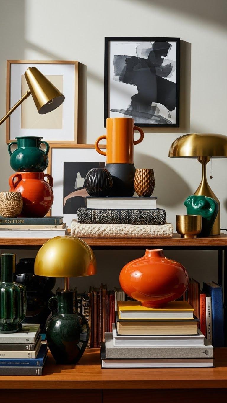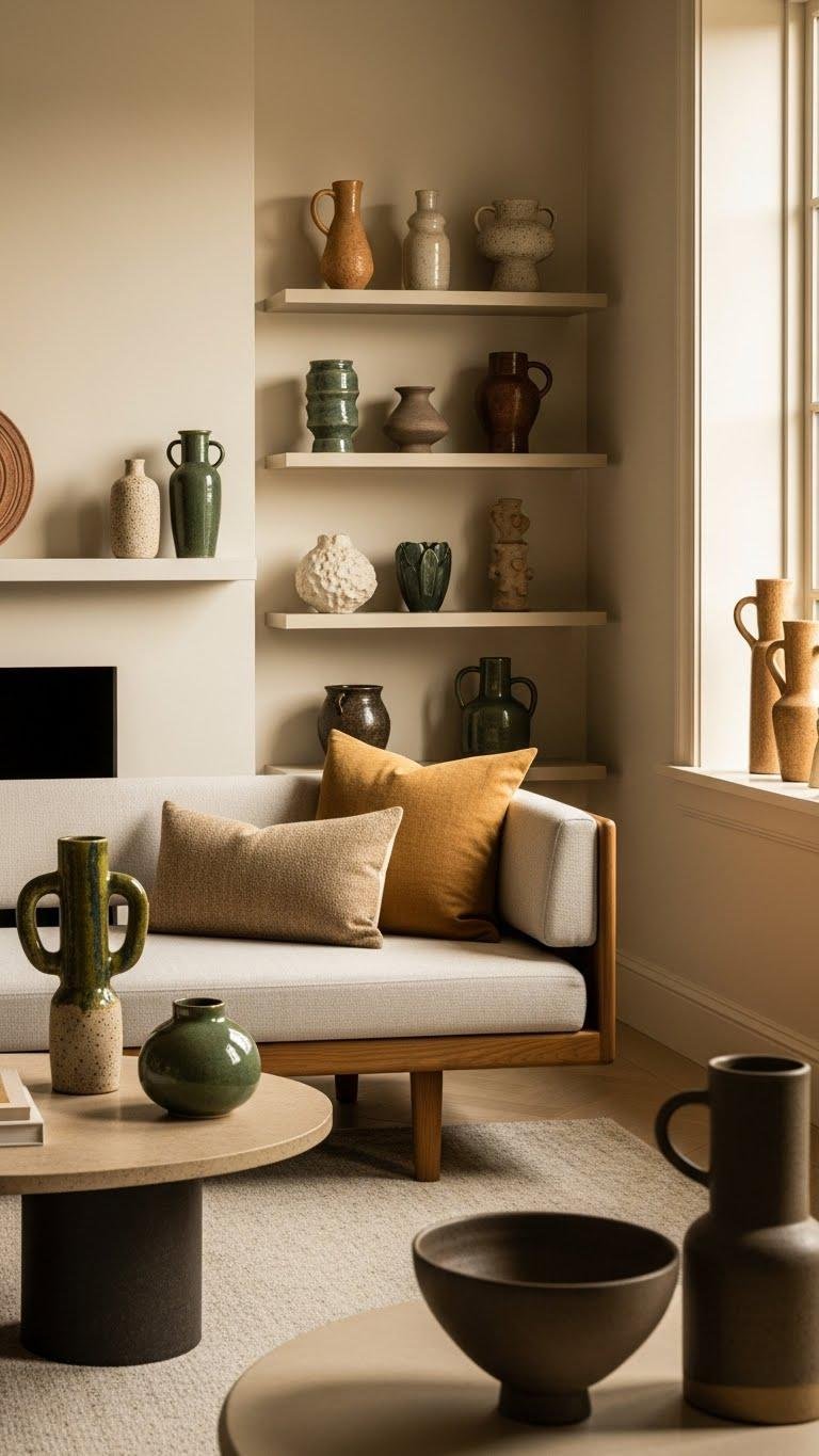 You’ll choose handbuilt vessels and glazed abstracts to punctuate shelves, mantels, and tables, mixing scale and finish.