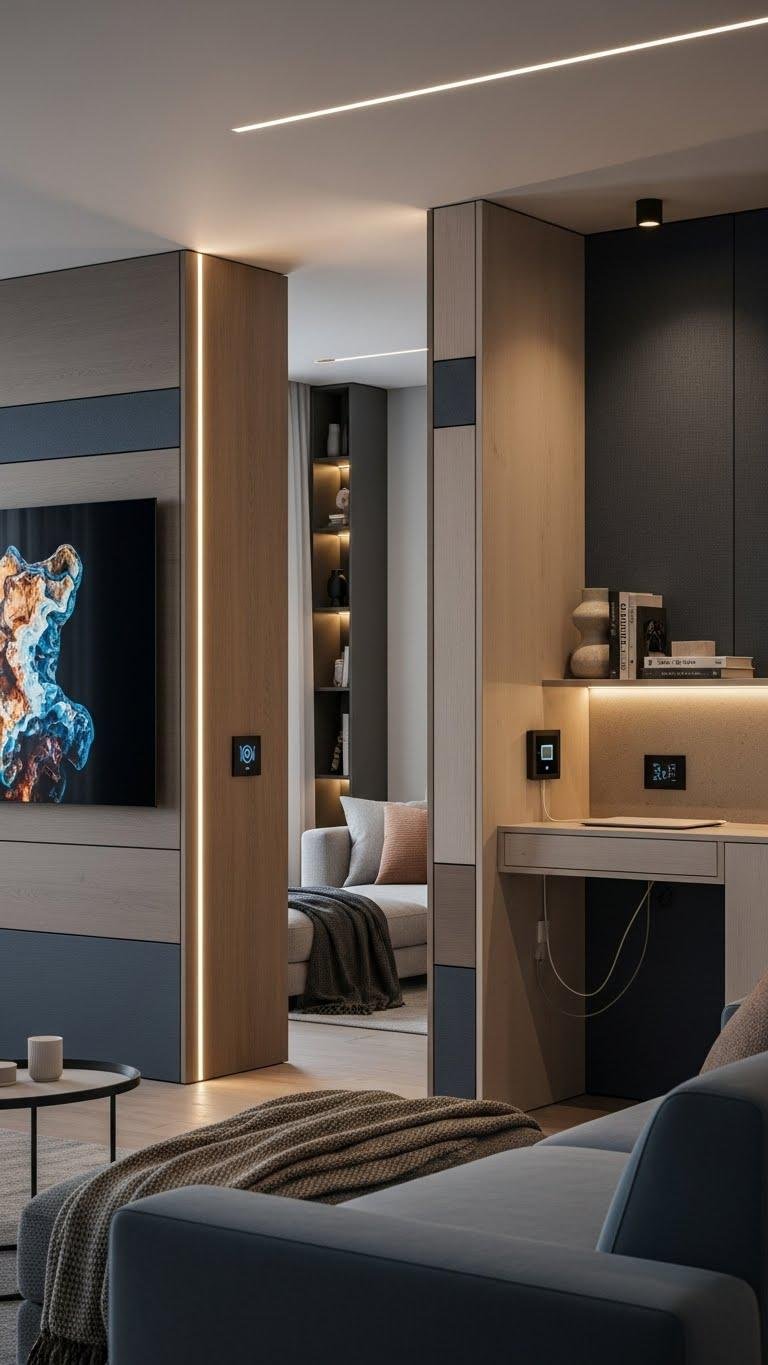 You’ll choose smart surfaces that hide wiring, charge devices, and display art on command. Discreet ambient controls tune light and sound to your mood, letting you roam freely through layered patterns and color while tech quietly amplifies comfort and expression.