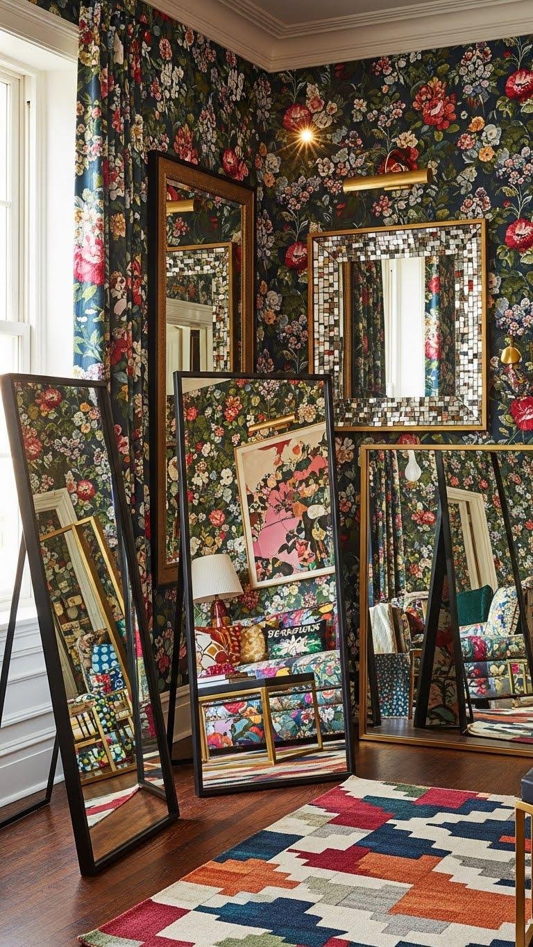 Frequently, oversized mirrors become the secret multiplier in maximalist rooms, reflecting and amplifying patterns, colors, and the layered textures you’ve carefully curated. You’ll place mirror mosaics to scatter light and repeat prints, choosing bold frame finishes that contrast or harmonize with wallpaper and textiles. Use leaning or gallery-mounted giants to expand vistas, double motifs, and give your space unapologetic visual freedom.