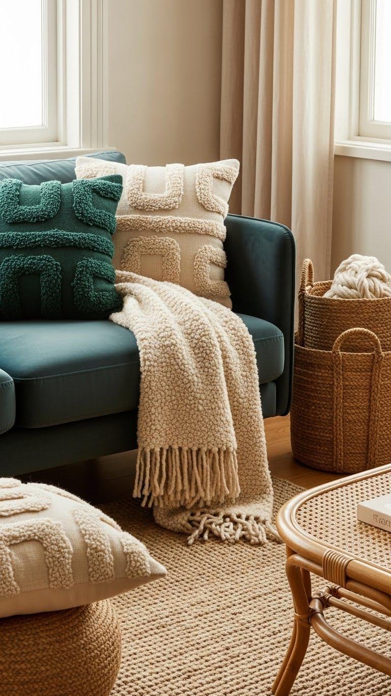 You’ll layer juicy boucle throws and sculptural pillows against raw jute baskets and woven rugs for grounded glamour. Mix scale and sheen confidently, letting natural weaves temper opulent fabrics so your space feels alive, free, and intentionally eclectic.