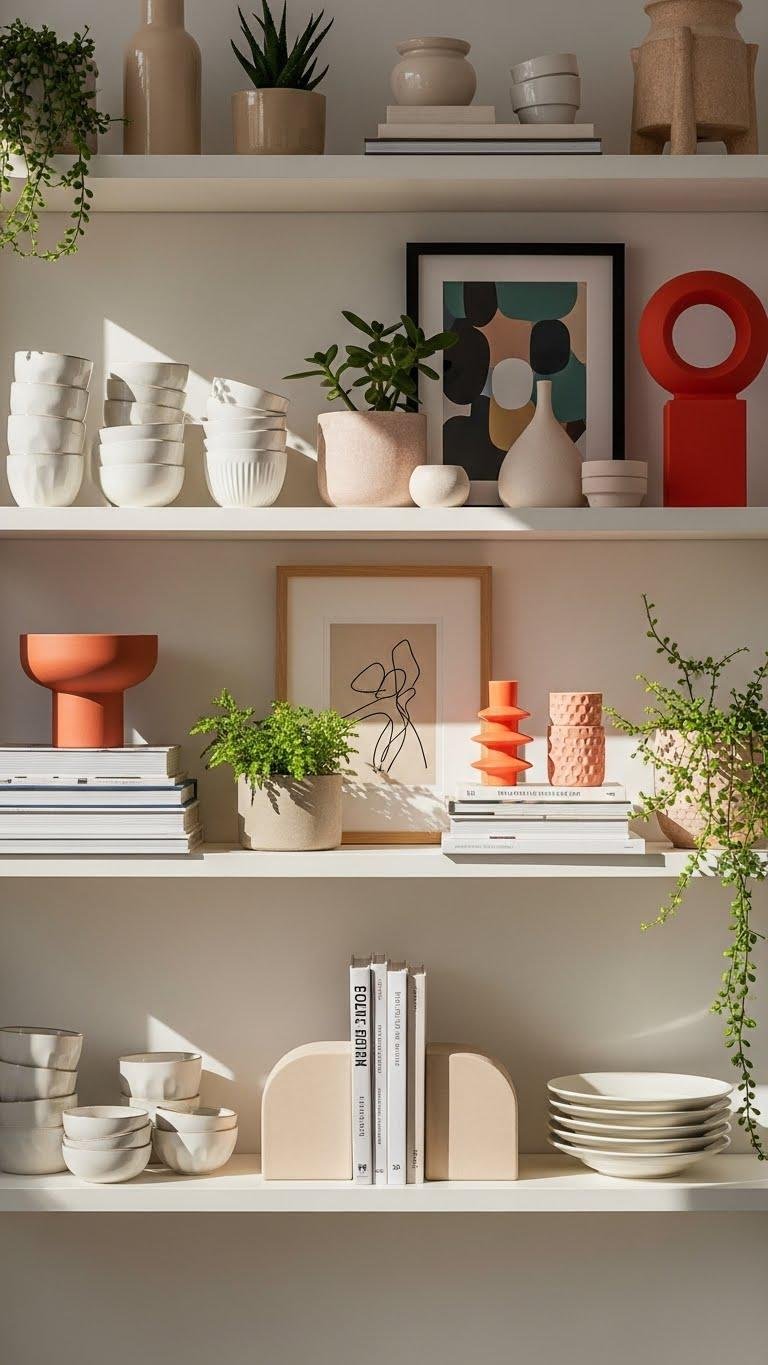 Curate your open shelving like a mini-gallery that tells a story about who you’re — mix groupings of objects by color, material, and scale to create deliberate rhythms across the shelves.