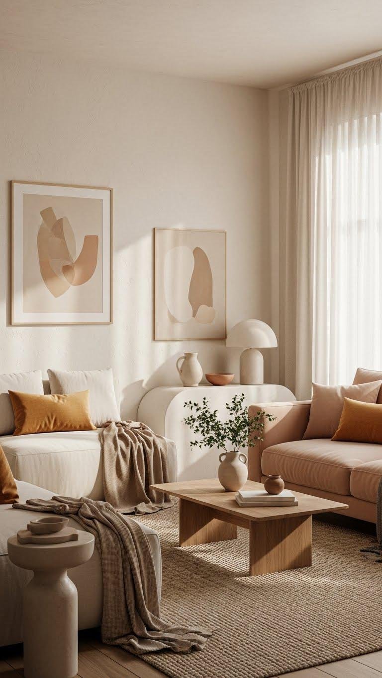 When you choose a soft warm neutral palette, your space feels instantly calm and inviting; creams, warm beiges, gentle taupes, and muted terracottas work together to soften light and highlight textures. You’ll favor muted ochre accents and blush beige upholstery, keeping lines spare and breathable.