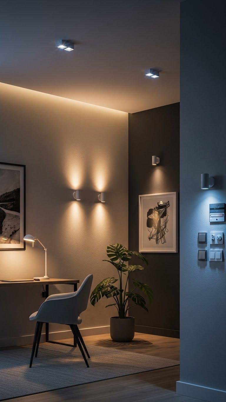 Think in layers: ambient light sets the room’s calm, task light lets you see clearly, and accent light sculpts points of interest—together they make the space feel intentional and alive. You’ll combine dimmable circuits and layered switches, choose color tunable bulbs for mood, and use indirect uplighting to wash walls. Keep fixtures minimal, placement thoughtful, and control effortless so the room breathes.