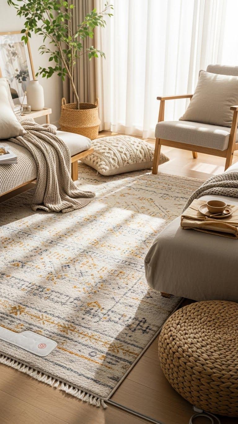 Choose subtle patterns and neutral hues so textures speak louder than prints. You’ll love boho inspired rugs for their lived-in warmth; pair them with heated rug pads for comfort.