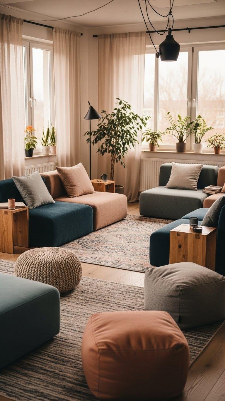 Pull pieces together so conversation can happen naturally: position seating to face one another while leaving enough breathing room for movement and flow. Let movable ottomans and modular poufs shift as needs change, creating clusters or clearing space. You’ll encourage ease and spontaneity, mixing low-profile chairs and a simple side table so voices carry, feet relax, and gatherings feel open, intentional, and free.