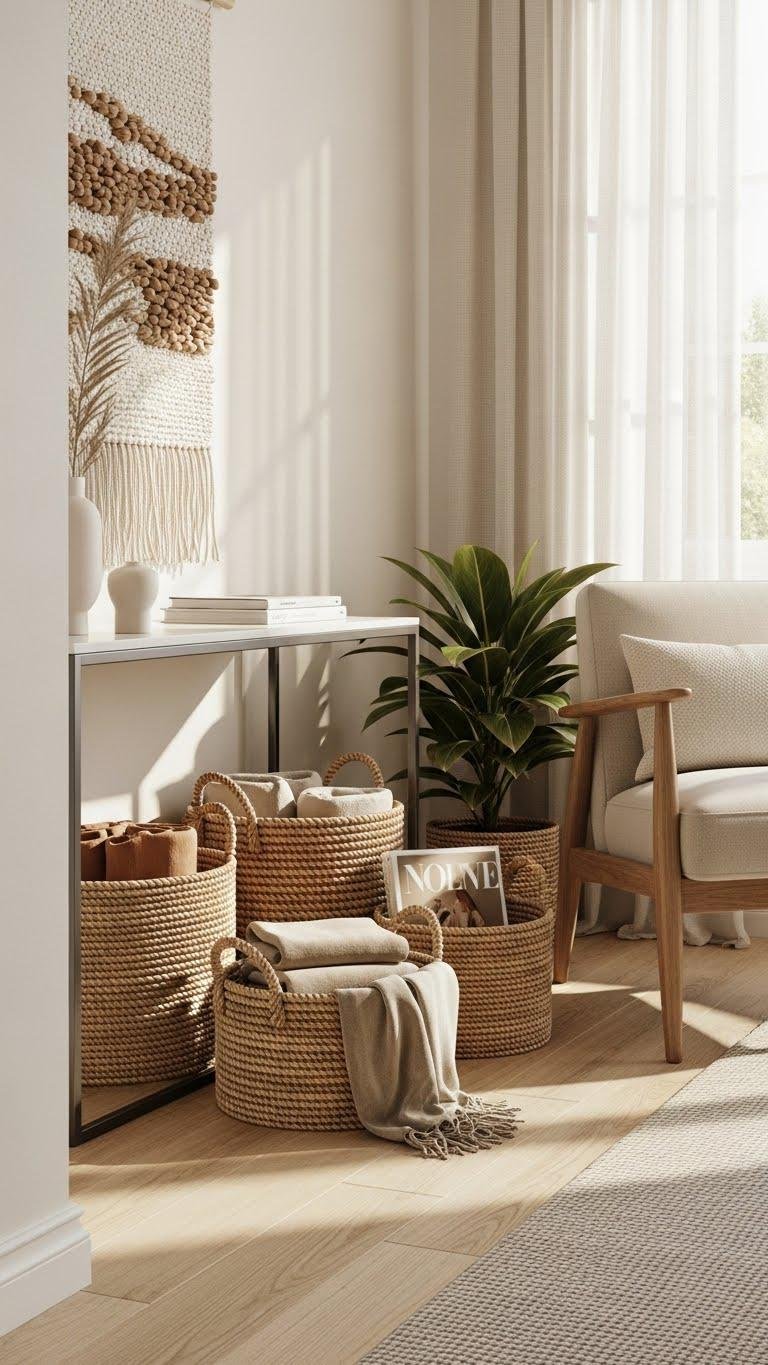 Tuck woven baskets into corners, beneath console tables, or next to seating to instantly warm a minimalist room and introduce tactile contrast. You’ll mix rope handled baskets with a woven wall hanging to layer texture without clutter.