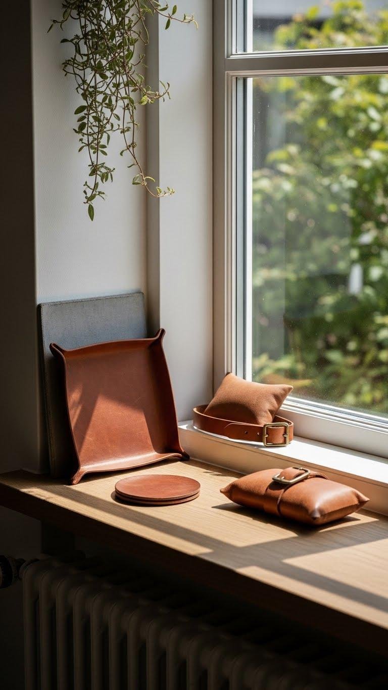 Add a patina leather tray, a slim belted cushion, or a worn-edge coaster to lend depth without clutter.