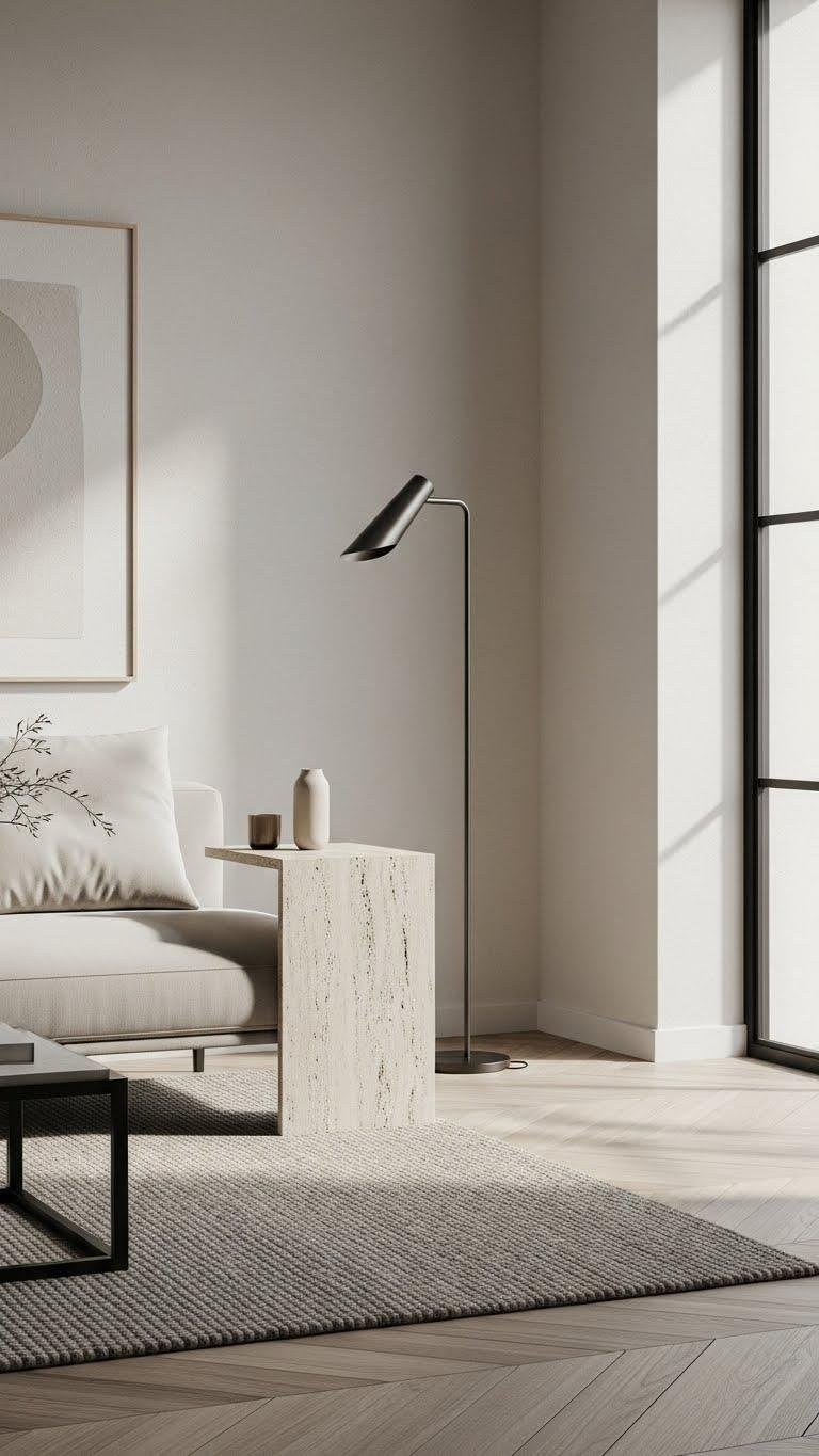 Although striking, travertine and marble work best as small, deliberate accents in a minimalist room; you’ll get the stone’s natural veining and cool weight without overpowering the calm.
