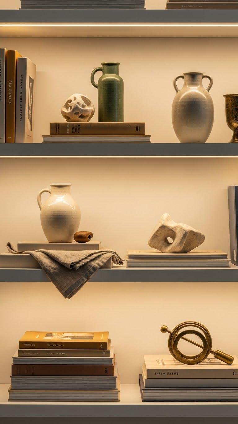 Layer books and found objects with intention to create shelves that feel curated, not cluttered. You’ll use book stacking and object rotation to keep displays fresh, pairing tactile artifacts with clean lines. Embrace negative space as a deliberate pause. Add hidden lighting to highlight textures and cast soft warmth. You’ll edit ruthlessly, choosing pieces that liberate the eye and invite calm.