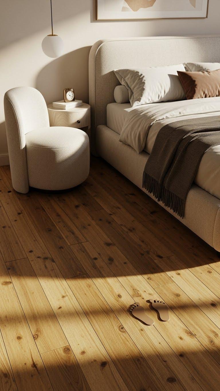 Soft-edged bedheads and rounded upholstery make a room feel sheltered and tactile; warm-toned floors then root that softness so the space reads both cozy and composed. Choose wide plank boards in a warm stain or reclaimed wood to add character while keeping lines clean. You’ll enjoy barefoot warmth with radiant heat beneath, and the result feels liberated, minimal, and inviting.