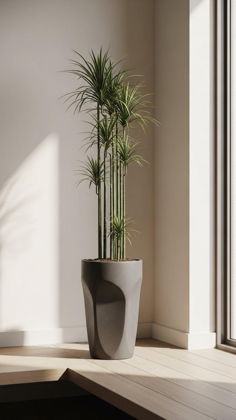 Contrast brings calm: place a single sculptural pot with a tall, architectural plant to punctuate a minimalist room and give it life without clutter. You’ll choose minimalist planters that echo negative space, letting sculptural foliage command attention. Position near light, rotate for balance, and keep surfaces clear. The result feels deliberate, free, warm — a quiet statement that breathes.