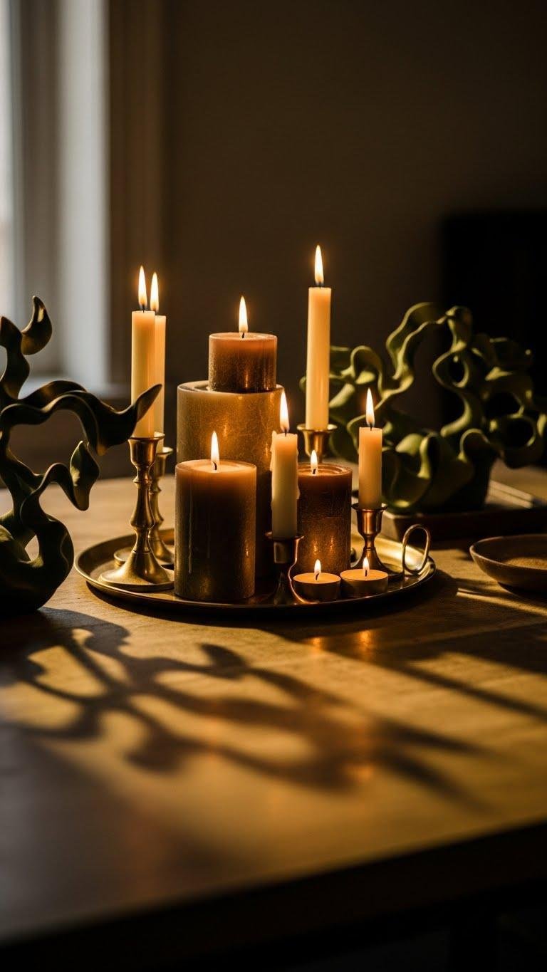 After you’ve let sculptural greenery breathe, bring warmth and intimacy with layered candles and brass holders. Arrange scented clusters on trays, mixing pillar, taper and tea lights so glow spills softly. Vary holder heights to create movement and shadow, and keep surfaces uncluttered. You’ll craft a calm, liberated atmosphere that feels intentional, tactile and quietly joyful without excess.
