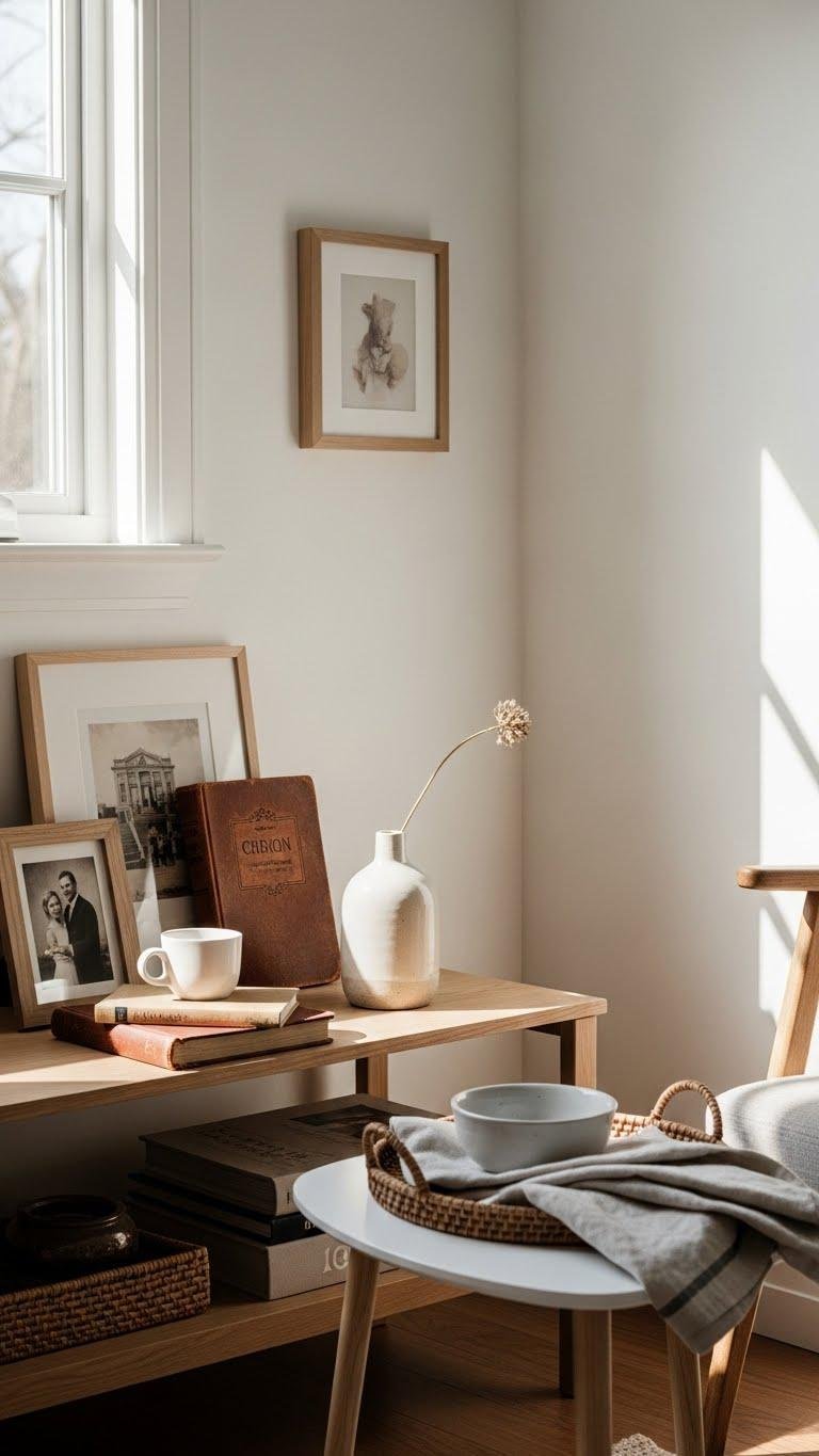 Build minimal vignettes—two or three objects with texture and meaning—so each surface feels open, deliberate, and freeing rather than cluttered or prescribed.