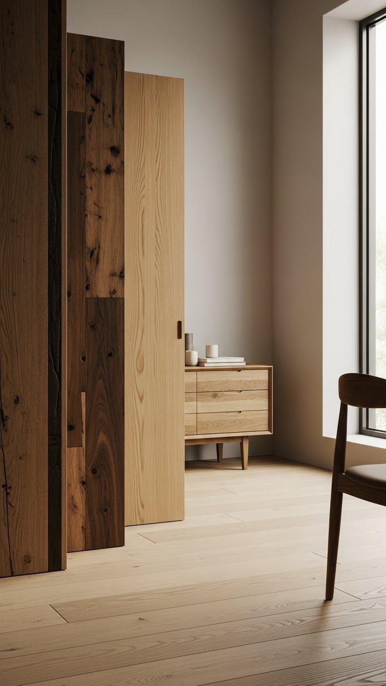 If you layer woods in different tones—pale ash, honey oak, smoked walnut—you’ll give a room depth and warmth without clutter. You’ll combine pale ash with dark walnut accents and reclaimed wood surfaces for an intentional mixed tone palette.