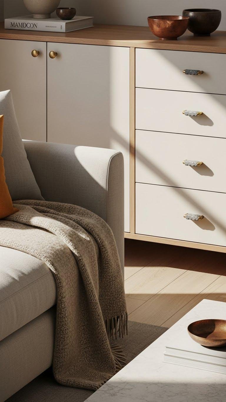 Once you’ve settled on breathable linens and a chunky wool throw, let the other pieces whisper refinement: choose furniture and hardware with richly rendered finishes that read luxe without fuss. You’ll favor matte lacquer surfaces, hand rubbed wood edges, stonewashed brass pulls and patinaed copper accents. These restrained details anchor the room, celebrate texture, and let your space breathe while feeling resolutely alive.