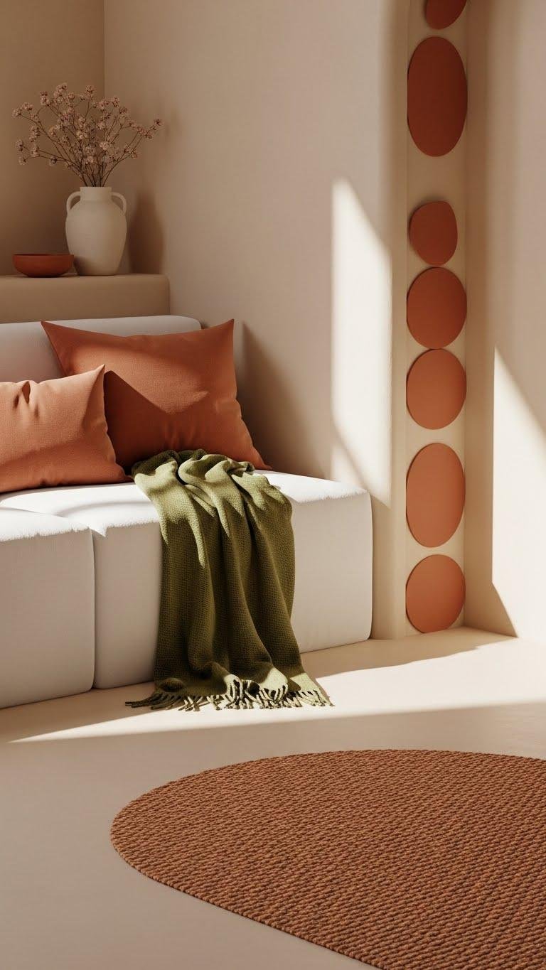 You’ll introduce pockets of terra cotta and moss green—think cushions, throws, a rug corner—to anchor space and invite ease. Keep shapes simple, repeat tones sparingly, and let natural light play off those hues so the room breathes and you feel free.