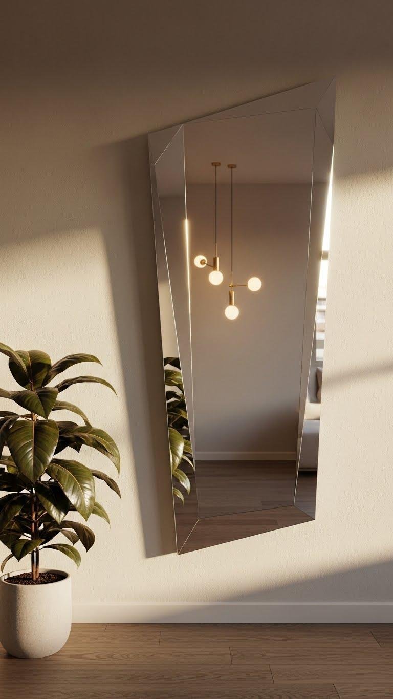 Hang a sculptural mirror to amplify light and introduce dimensional interest without cluttering your minimalist scheme. You’ll mount it like sculptural lighting, angling surfaces to catch sun and soft bulbs, creating layered brightness.