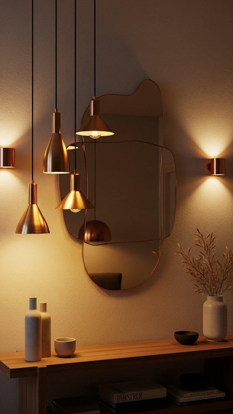After the sculptural mirror adds depth and warm reflections, choose warm-metal lighting to echo its glow and anchor the room.