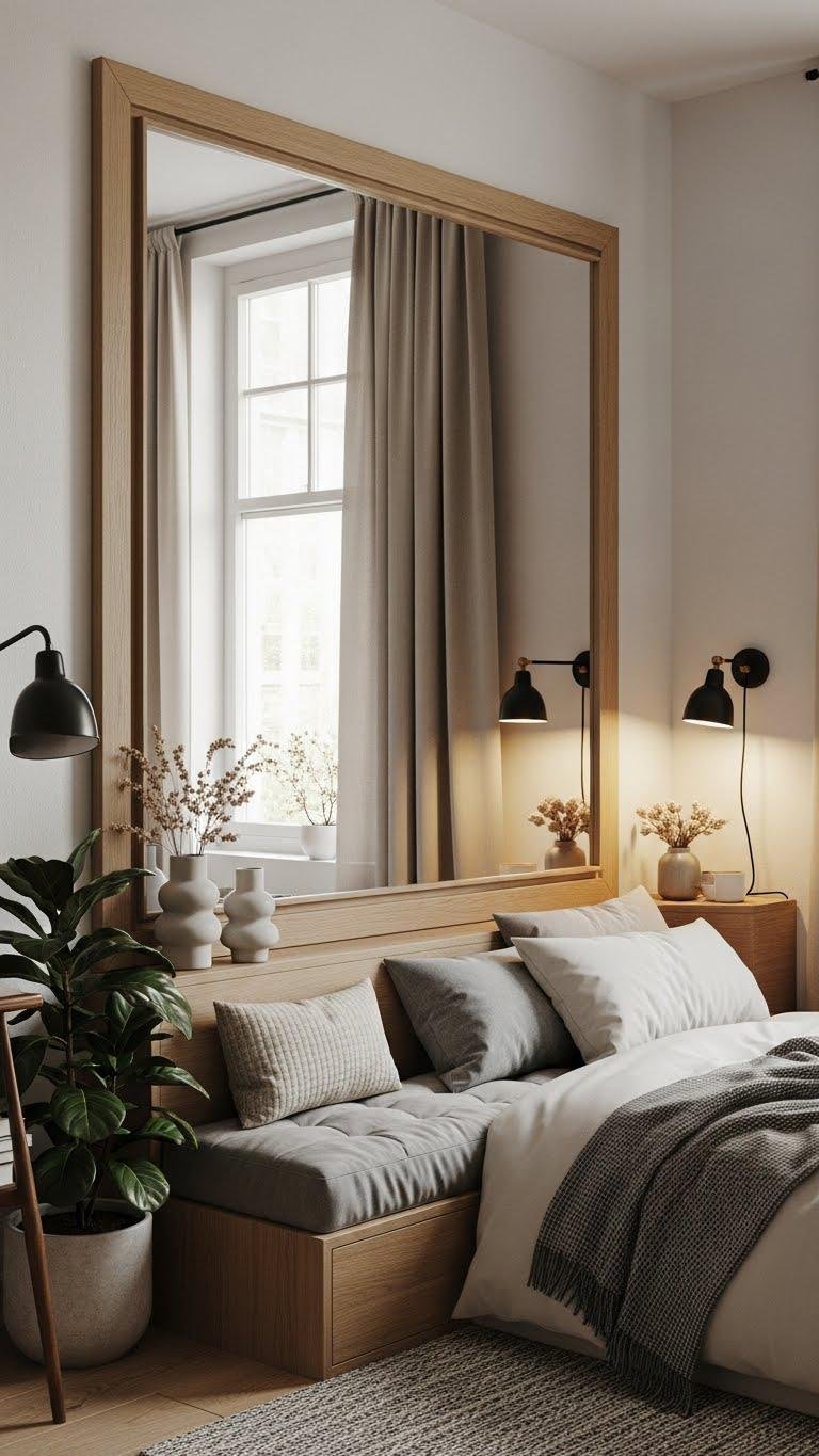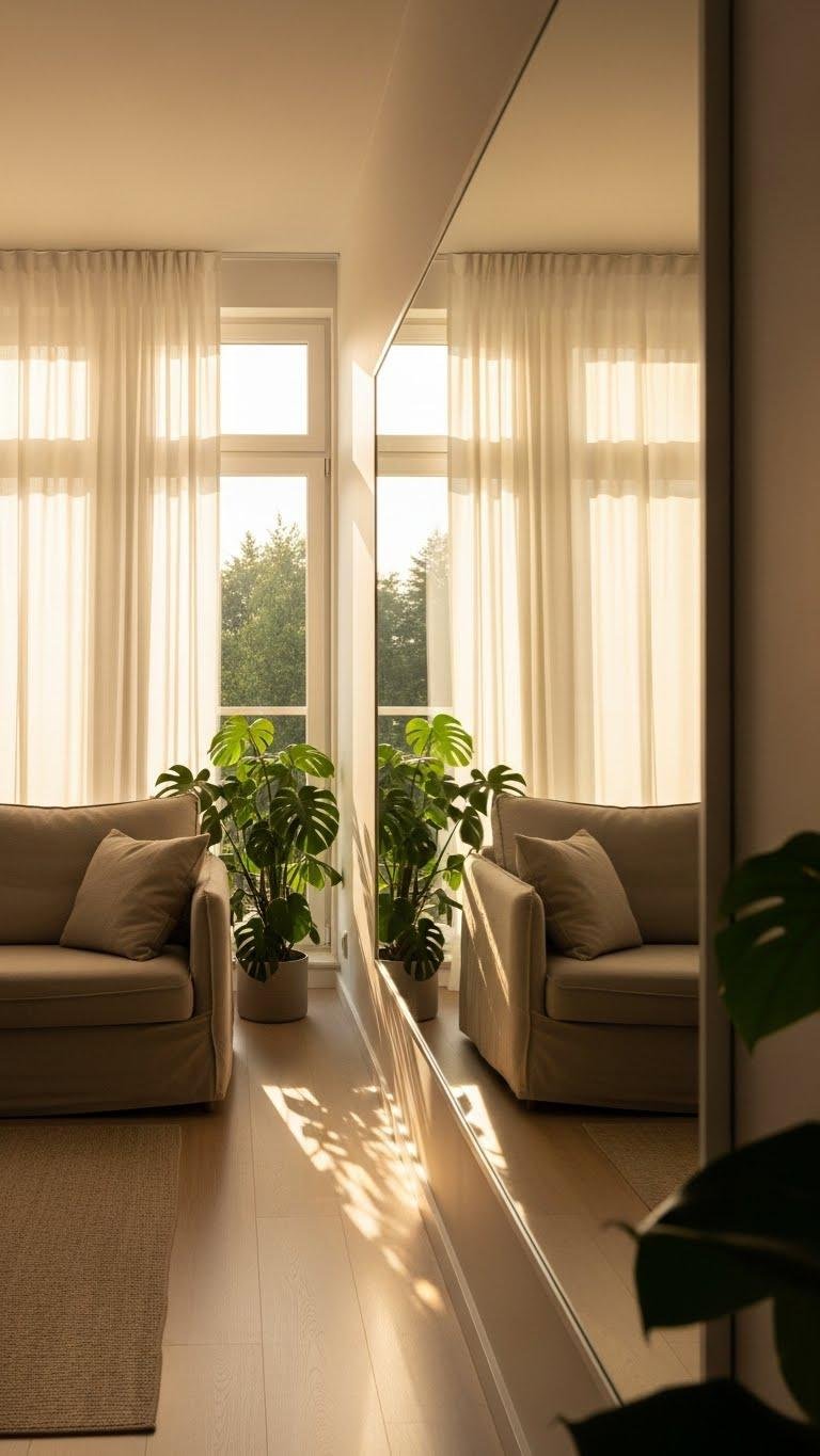 Place a mirror directly across from a window to double the daylight and instantly brighten dark corners; you’ll catch and redirect sunbeams deeper into the room, expanding perceived space and lifting the mood. Position a frameless or slim-frame mirror to maximize reflected natural daylight while preserving privacy buffering with sheer curtains or strategic plant placement, keeping the vibe airy, free, and modern.