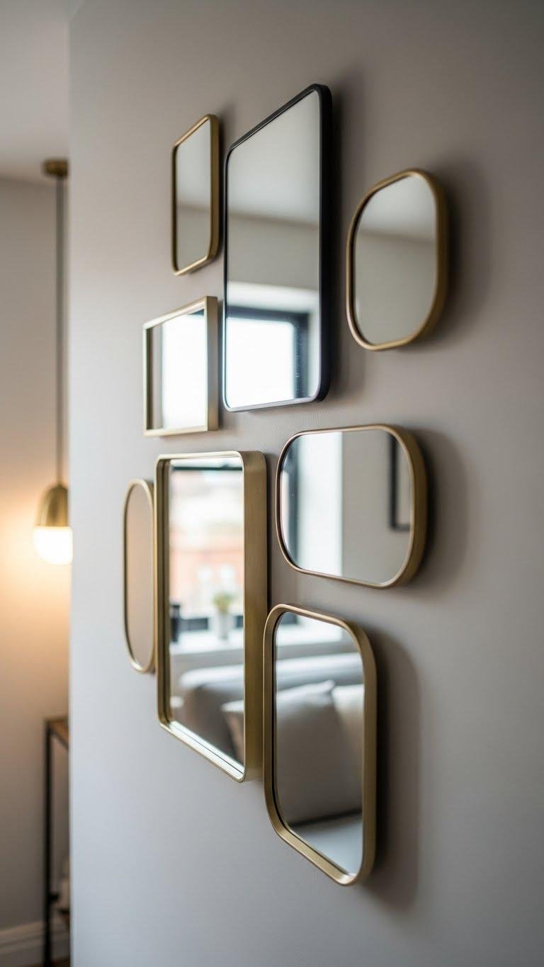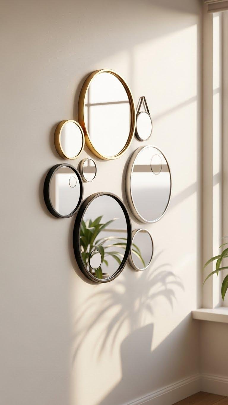 Arrange varied sizes, mix metallic frames and reflective decals, and keep spacing organic.