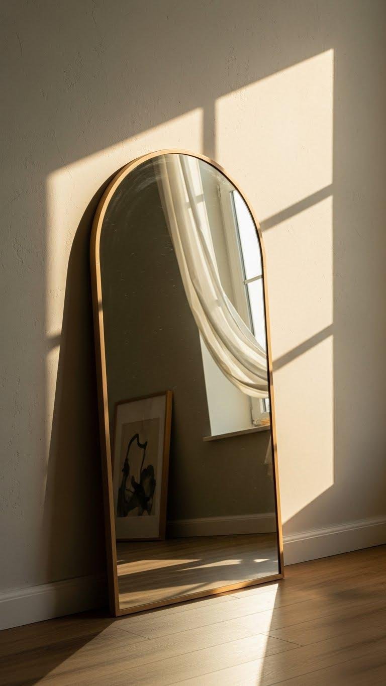 Lean an arched mirror against a wall to soften a room’s edges while visually stretching the space—its curved top breaks rigid lines and reflects light in a more forgiving, sculptural way.